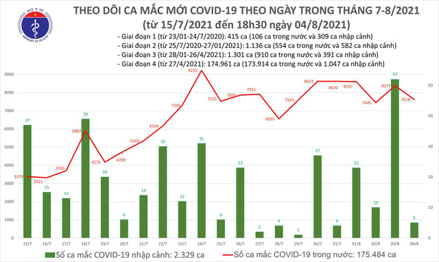 - Tính đến chiều ngày 04/8, Việt Nam có 177.813 ca nhiễm trong đó có 2.329 ca nhập cảnh và 175.484 ca mắc trong nước.