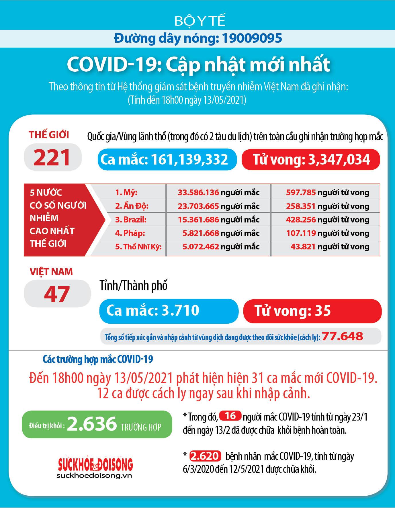 Bản tin chiều 13/5 của Bộ Y tế cho biết có thêm 31 ca mắc COVID-19, trong đó 12 ca nhập cảnh đã cách ly ngay; 19 ca còn lại ghi nhận trong nước tại khu vực đã được cách ly, phong toả.