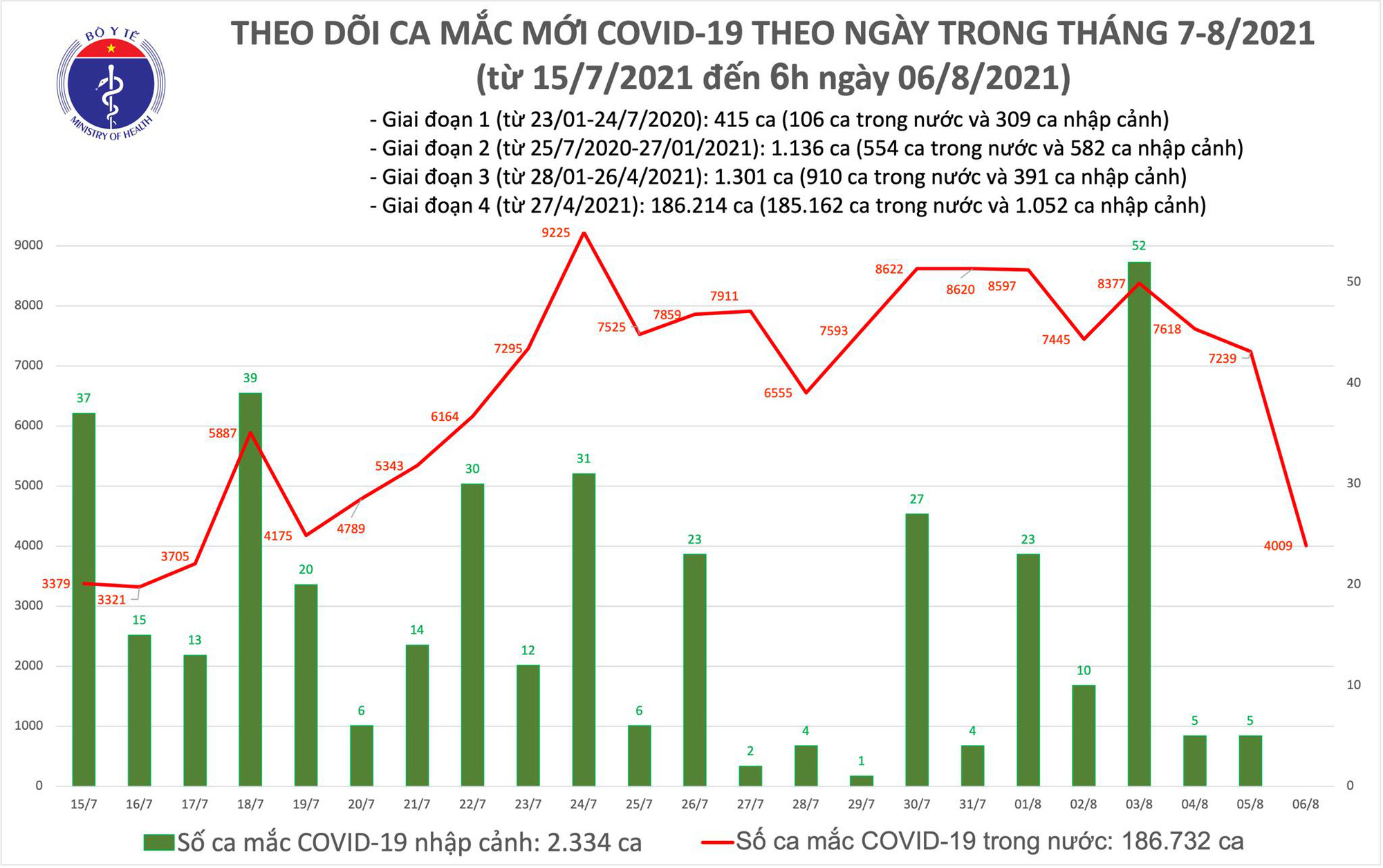 - Tính đến sáng ngày 06/8, Việt Nam có 189.066 ca nhiễm trong đó có 2.334 ca nhập cảnh và 186.732 ca mắc trong nước.