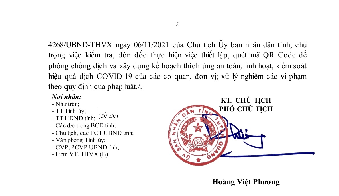 Để đảm bảo công tác phòng, chống dịch Covid-19 và thực hiện có hiệu quả chủ trương "Thích ứng an toàn, linh hoạt, kiểm soát hiệu quả dịch Covid-19" trên địa bàn tỉnh. Ngày 12/11/2021, Uỷ ban nhân dân tỉnh Tuyên Quang ban hành Văn bản số 4402/UBND-THVX điều chỉnh một số một số biện pháp kiểm soát hiệu quả dịch bệnh Covid-19.