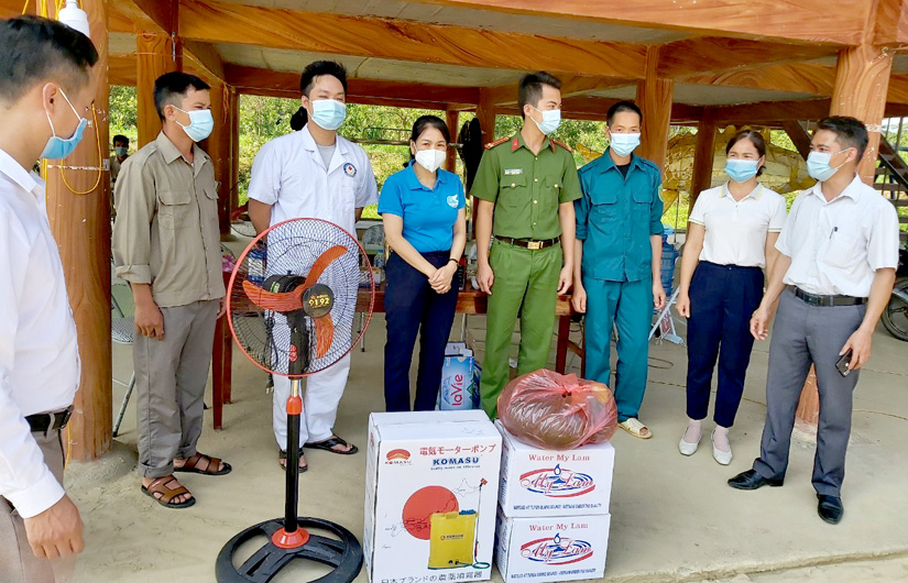 Chiều 20-5, Hội LHPN nữ tỉnh đã đến thăm hỏi, động viên và trao tặng 5 máy khử khuẩn, 5 quạt cây, nước uống và hoa quả cho cán bộ, chiến sỹ đang thực hiện nhiệm vụ tại 5 chốt, trạm kiểm soát dịch bệnh Covid-19 trên địa bàn thôn Hợp Long 1 và thôn Khuôn Khoai, xã Yên Nguyên (Chiêm Hóa).