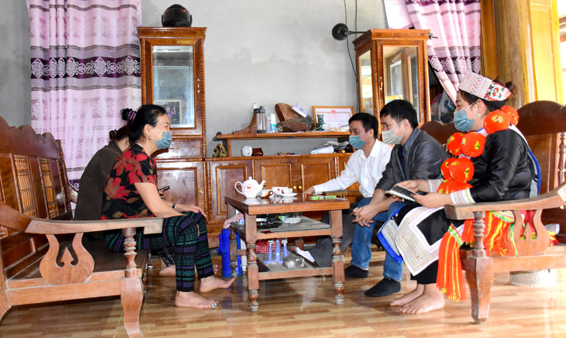 Nhân viên y tế thôn Lũng Giềng, xã Xuân Lập (Lâm Bình) tuyên truyền người dân về phòng, chống dịch Covid-19.
