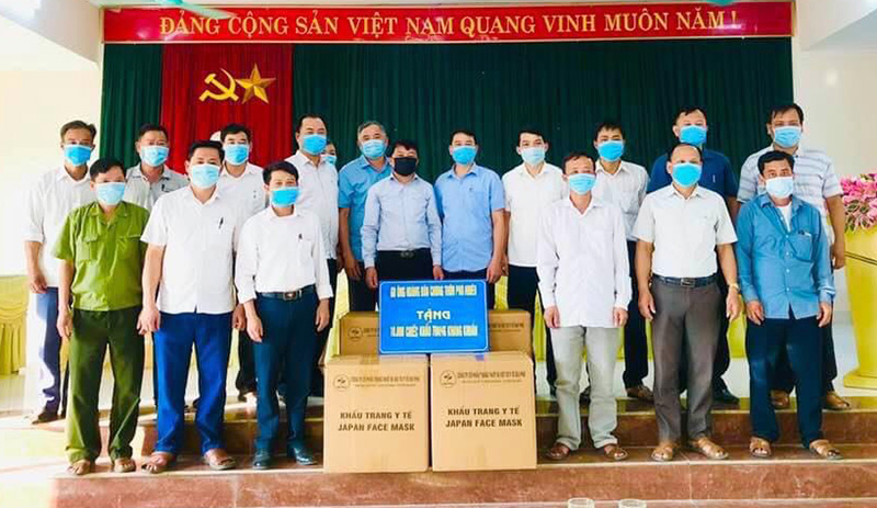 Ông Hoàng Văn Chung (đeo khẩu trang đen) trao tặng 10.000 khẩu trang y tế cho UBND xã Phú Lương.