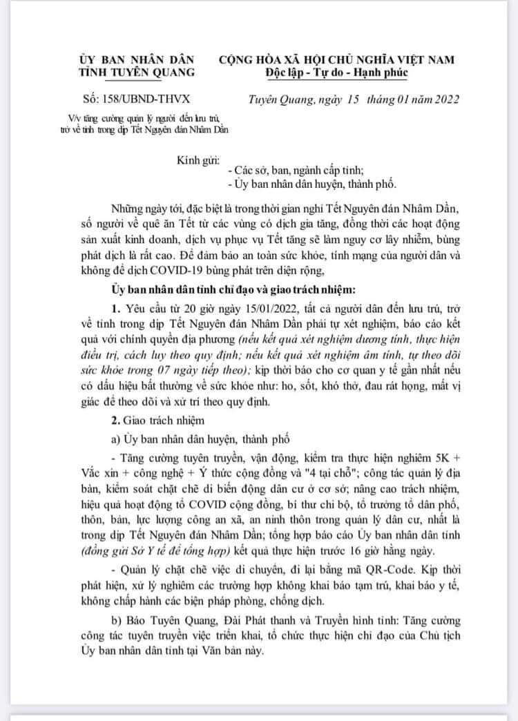 Ngày 15-1, UBND tỉnh ban hành văn bản số 158/UBND-THVX về việc tăng cường quản lý người đến lưu trú, trở về tỉnh trong dịp Tết Nguyên đán Nhâm Dần, cụ thể như sau: