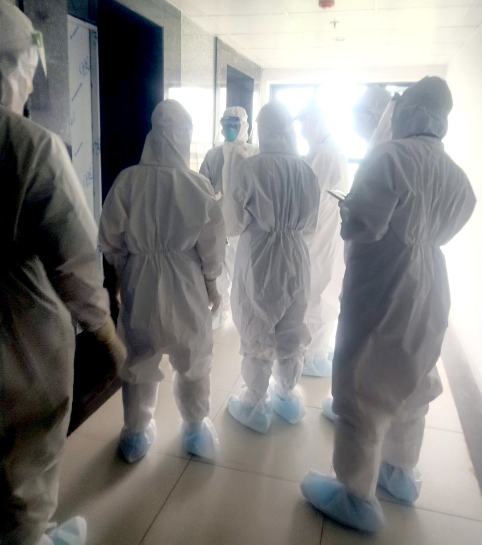 Cán bộ y tế đoàn Tuyên Quang trên đường đi thay ca trực (ảnh phải).