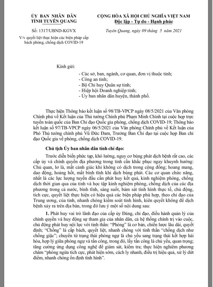 Ủy ban nhân dân tỉnh vừa có Công văn số 1317/UBND-KGVX ngày 09/5/2021 về việc quyết liệt thực hiện các biện pháp cấp bách phòng, chống dịch COVID-19, Ban biên tập Cổng thông tin điện tử Đảng bộ tỉnh xin đăng tải đầy đủ nội dung của công văn