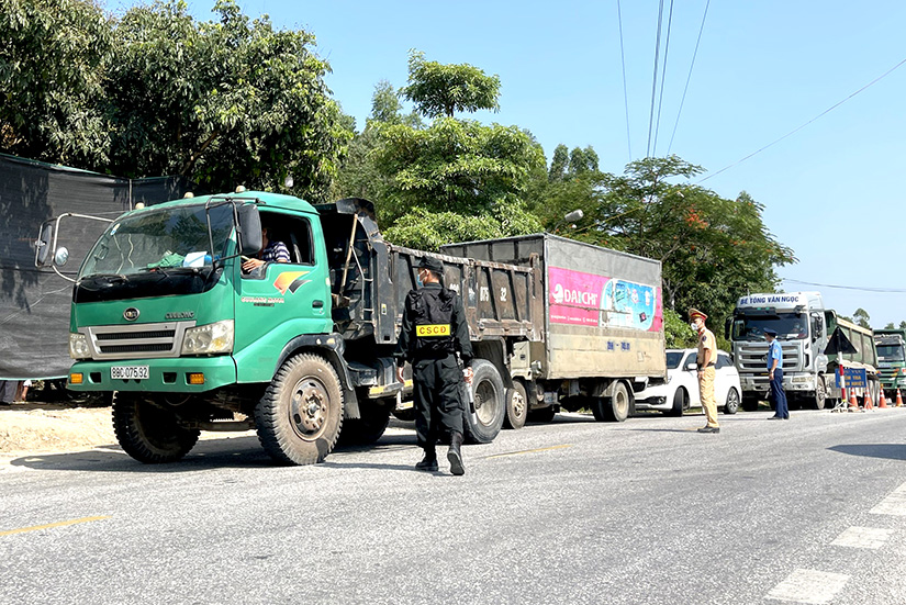 Các lực lượng thực hiện kiểm soát phương tiện tại chốt trên tuyến Quốc lộ 2C xã Sơn Nam (Sơn Dương).