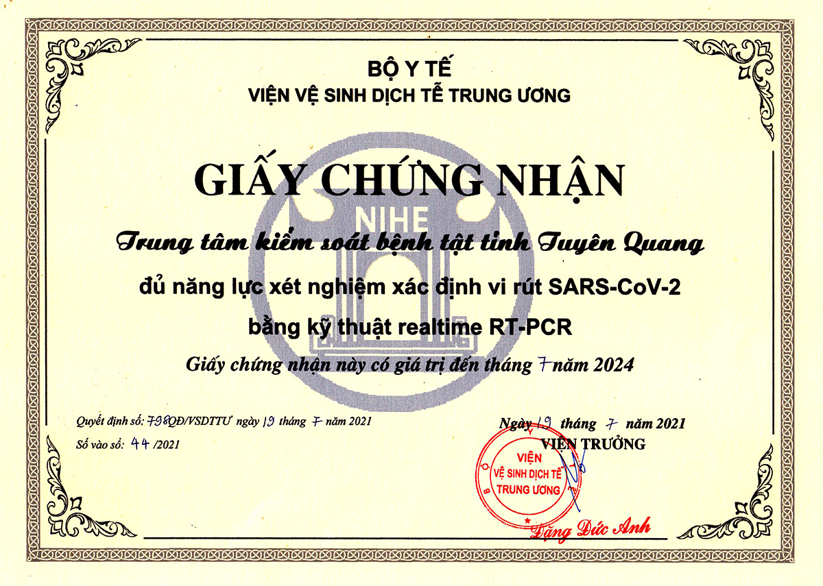 Viện Vệ sinh dịch tễ Trung ương, Bộ Y tế vừa ký quyết định cấp Giấy chứng nhận năng lực xét nghiệm khẳng định virus SARS- CoV-2 (Covid-19) bằng kỹ thuật Realtime RT-PCR cho Trung tâm Kiểm soát bệnh tật tỉnh.