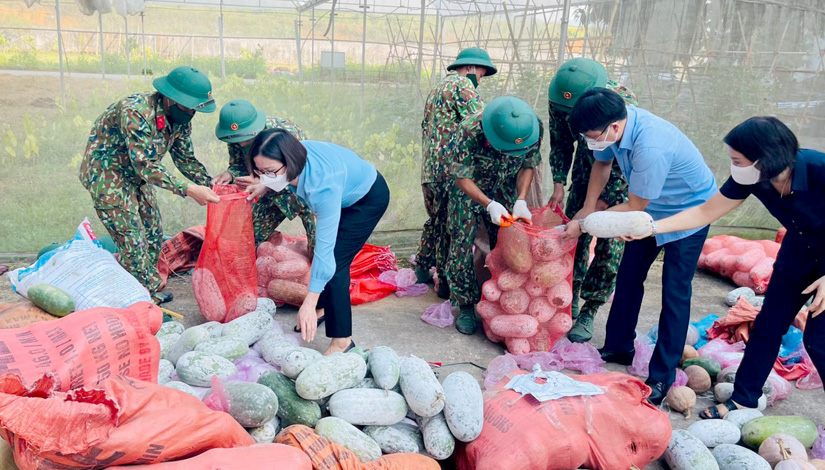 Cán bộ Hội Nông dân, Hội Chữ thập đỏ và chiến sỹ Trung đoàn 148 đóng gói nông sản gửi về vùng dịch. Nguồn ảnh: baotintuc.vn