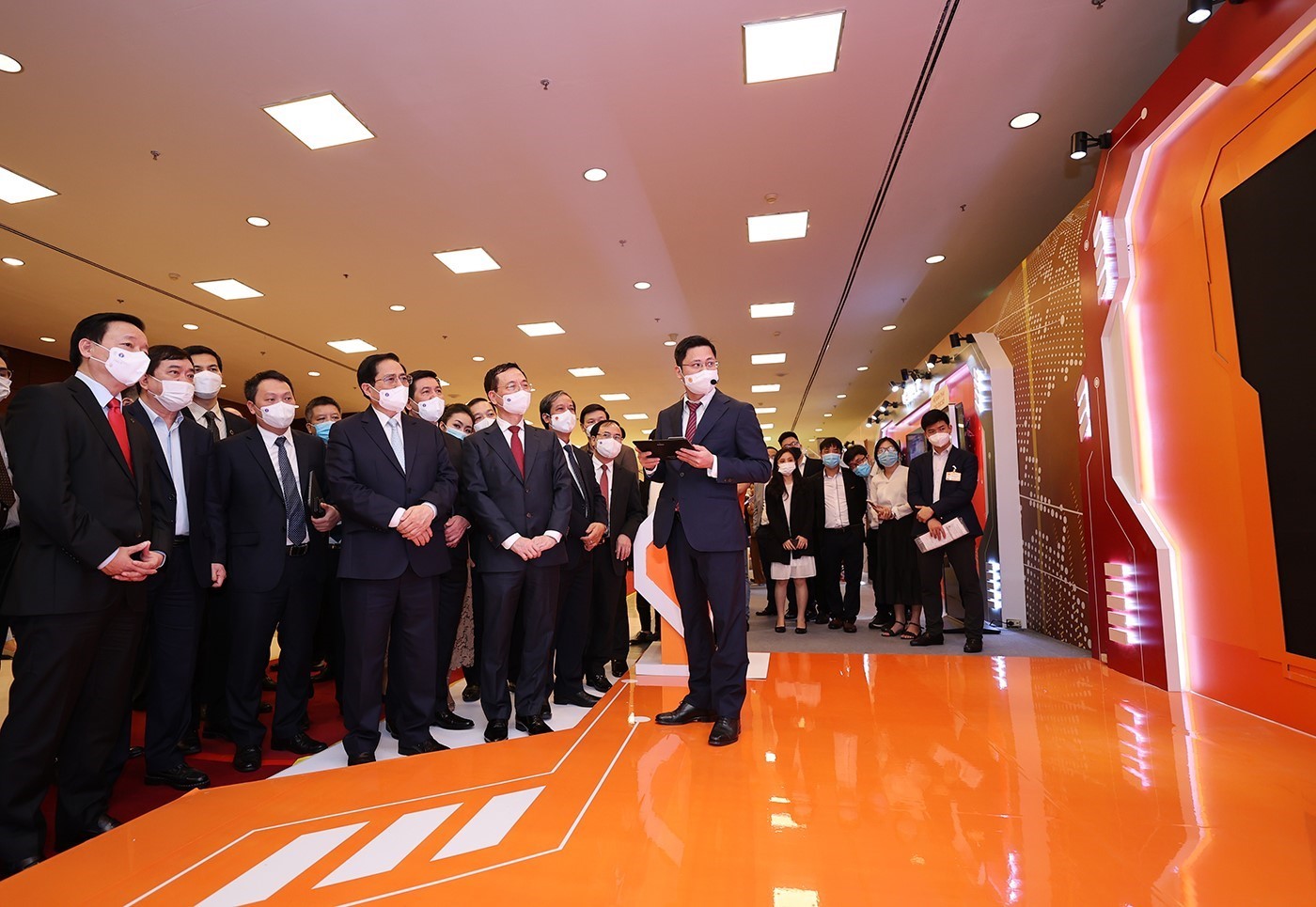 Ủy viên Bộ Chính trị, Thủ tướng Chính phủ Phạm Minh Chính tham quan gian trưng bày sản phẩm công nghệ số tại Diễn đàn quốc gia Phát triển doanh nghiệp công nghệ số lần thứ ba - năm 2021 với chủ đề “Chuyển đổi số - Động lực phục hồi và phát triển kinh tế”_Ảnh: TTXVN