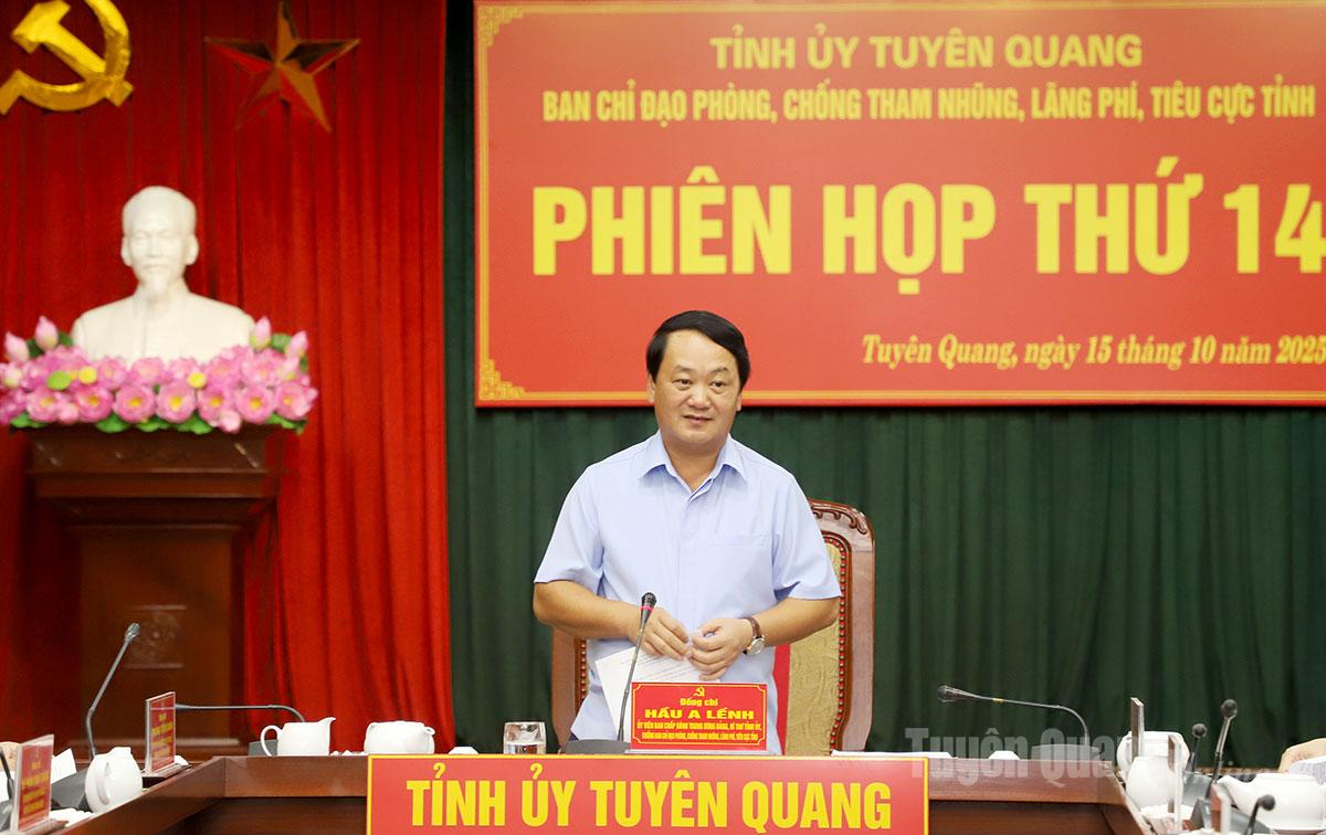 Chiều 15-10, Ban Chỉ đạo phòng, chống tham nhũng, lãng phí, tiêu cực (BCĐ) tỉnh tổ chức họp Phiên thứ 14, nhằm đánh giá kết quả lãnh đạo, chỉ đạo, tổ chức thực hiện công tác phòng, chống tham nhũng, lãng phí, tiêu cực 9 tháng, triển khai nhiệm vụ 3 tháng cuối năm 2025. Đồng chí Hầu A Lềnh, Ủy viên BCH Trung ương Đảng, Bí thư Tỉnh ủy, Trưởng BCĐ chủ trì phiên họp. Cùng dự có đồng chí Lê Thị Kim Dung, Phó Bí thư Thường trực Tỉnh ủy; các đồng chí Ủy viên Ban Thường vụ Tỉnh ủy thành viên BCĐ; đại diện Ban Nội chính Trung ương.
