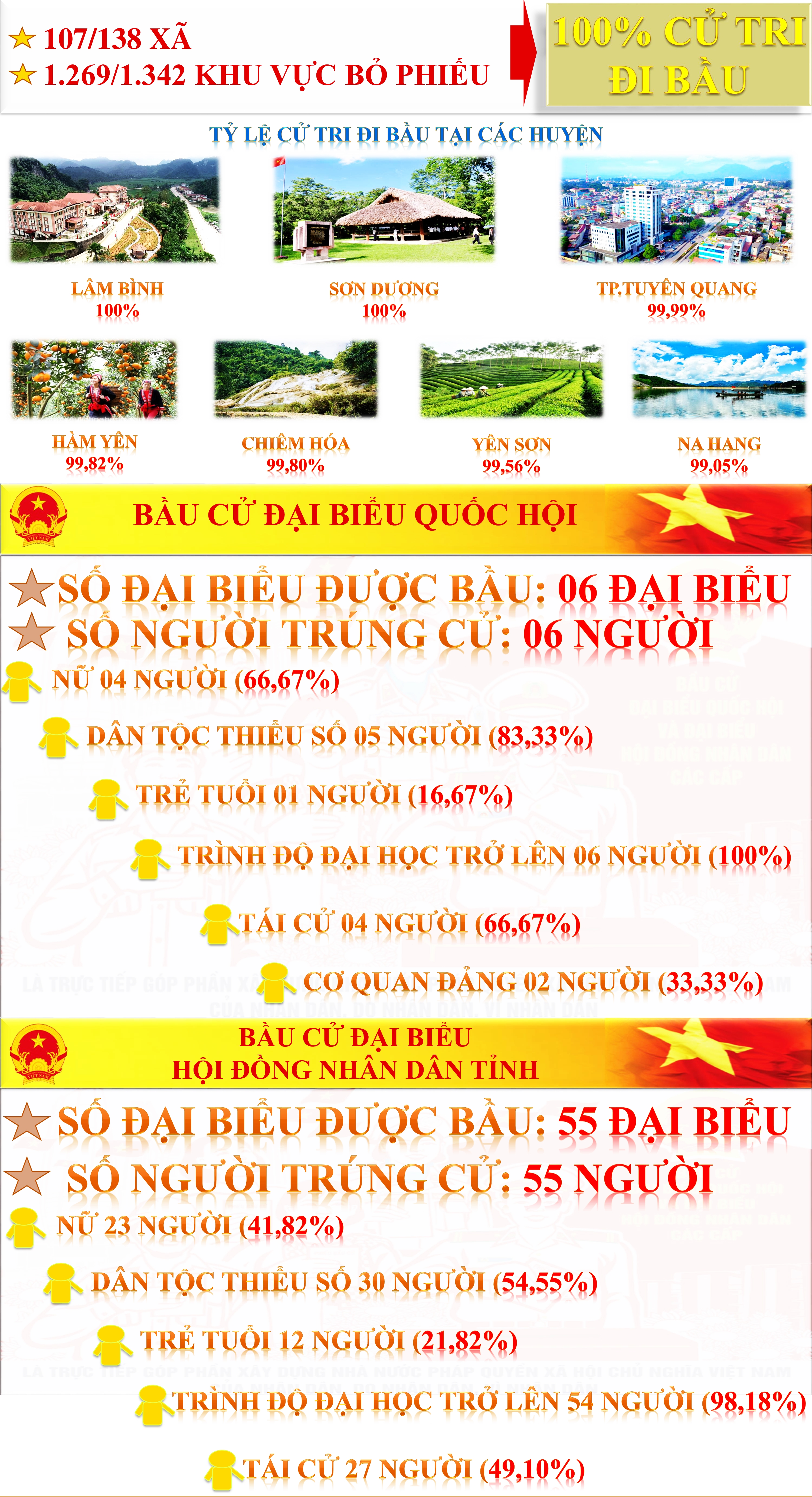 Toàn tỉnh đã có 589.982/591.132 cử tri tham gia bầu cử, đạt 99,81%, có 107/138 xã và 1.269/1.342 khu vực bỏ phiếu có 100% cử tri đi bầu. Huyện Lâm Bình và huyện Sơn Dương có 100% cử tri đi bầu.