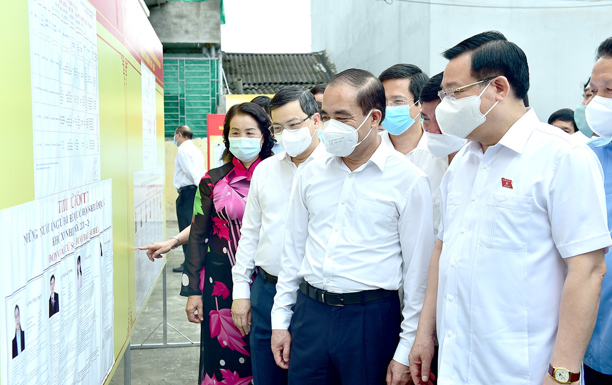 Chủ tịch Quốc hội Vương Đình Huệ kiểm tra danh sách những người ứng cử đại biểu Quốc hội tại đơn vị bầu cử số 2, phường An Tường thành phố Tuyên Quang. Ảnh: Thành Công