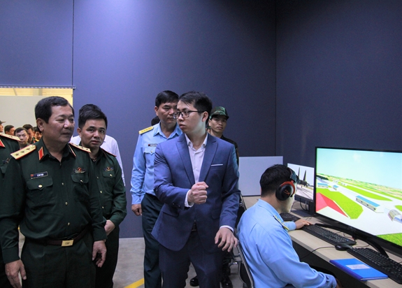 Thượng tướng Lê Huy Vịnh, Ủy viên Trung ương Đảng, Thứ trưởng Bộ Quốc phòng kiểm tra hệ thống mô phỏng huấn luyện phi công và kíp chỉ huy bay do Viettel nghiên cứu phát triển. Ảnh: Văn Phúc
