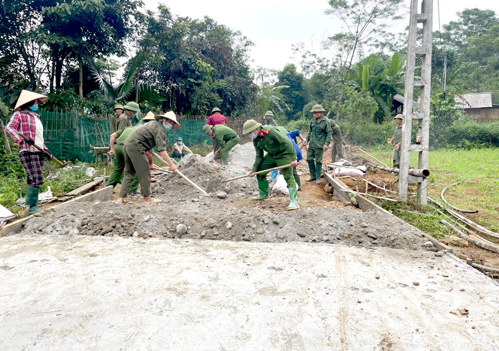 Lực lượng Công an xã cùng người dân thôn Cao Bình bê tông hóa đường giao thông nông thôn.
