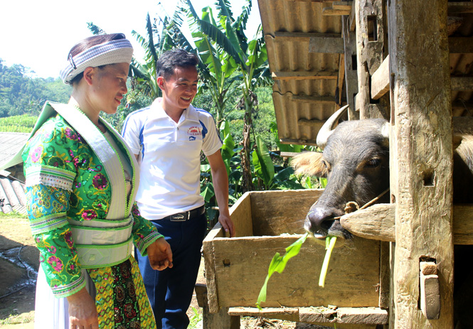xã Sinh Long hướng dẫn đồng bào Mông kỹ thuật chăn nuôi trâu nhốt chuồng.
