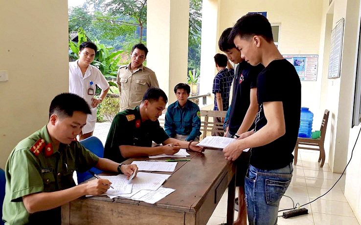 Cán bộ Công an huyện lâm Bình tiếp nhận, kiểm tra các thủ tục giấy tờ đăng ký sơ tuyển của công dân