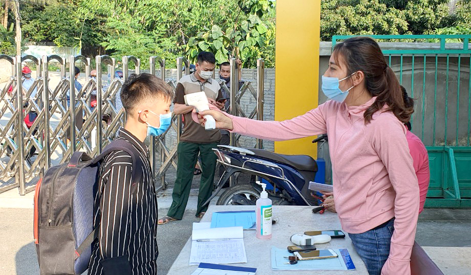 Giáo viên trường Phổ thông Dân tộc nội trú THCS huyện Yên Sơn đo thân nhiệt cho học sinh khi trở lại trường. Nguồn ảnh: baotuyenquang.com.vn