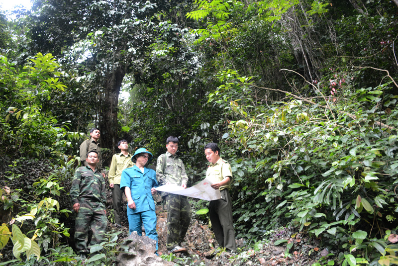 Kiểm lâm viên phối hợp với dân quân tự vệ xã Phúc Sơn (Chiêm Hóa) tuần tra bảo vệ rừng.