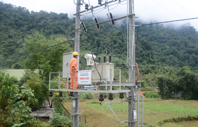 Nhân viên Điện lực Na Hang (Na Hang) kiểm tra vận hành trạm biến áp thôn Khau Cau, xã Phúc Yên.