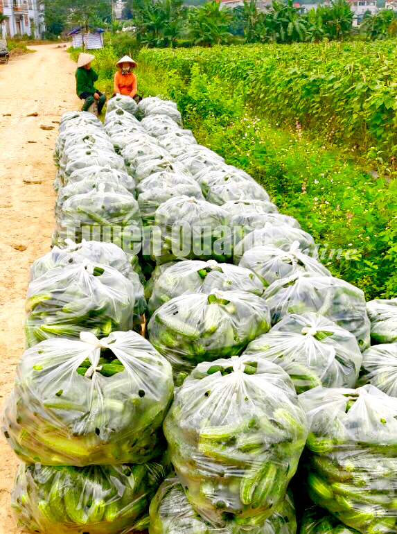 Mô hình trồng dưa leo tại xã Kim Phú thu hoạch đến đâu có thương lái thu mua hết đến đó.