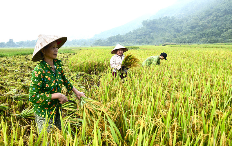 Nông dân xã Hồng Thái, Na Hang đã bước vào vụ gặt. Ảnh: Quang Hòa