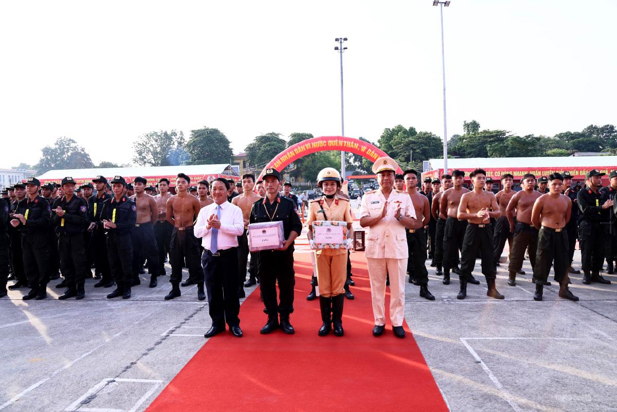 Các đồng chí: Bí thư Tỉnh uỷ Hầu A Lềnh, Giám đốc Công an tỉnh Nguyễn Đức Thuận tặng quà động viên các cán bộ chiến sĩ.