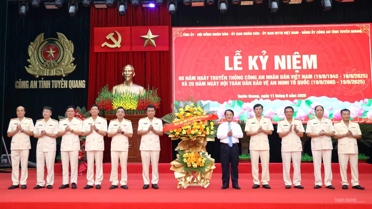 Chiều 11-8, tại Hội trường Công an tỉnh Tuyên Quang, Tỉnh ủy, HĐND, UBND, Ủy ban MTTQ tỉnh Tuyên Quang và Đảng uỷ Công an tỉnh tổ chức trọng thể Lễ kỷ niệm 80 năm Ngày truyền thống Công an Nhân dân Việt Nam (19/8/1945 - 19/8/2025) và 20 năm Ngày hội Toàn dân bảo vệ an ninh Tổ quốc (19/8/2005 - 19/8/2025).