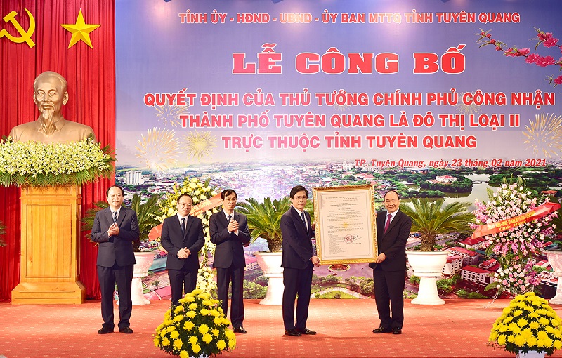 Thủ tướng Chính phủ Nguyễn Xuân Phúc trao Quyết định công nhận thành phố Tuyên Quang là đô thị loại II trực thuộc tỉnh Tuyên Quang cho lãnh đạo thành phố Tuyên Quang. Ảnh: Thành Công