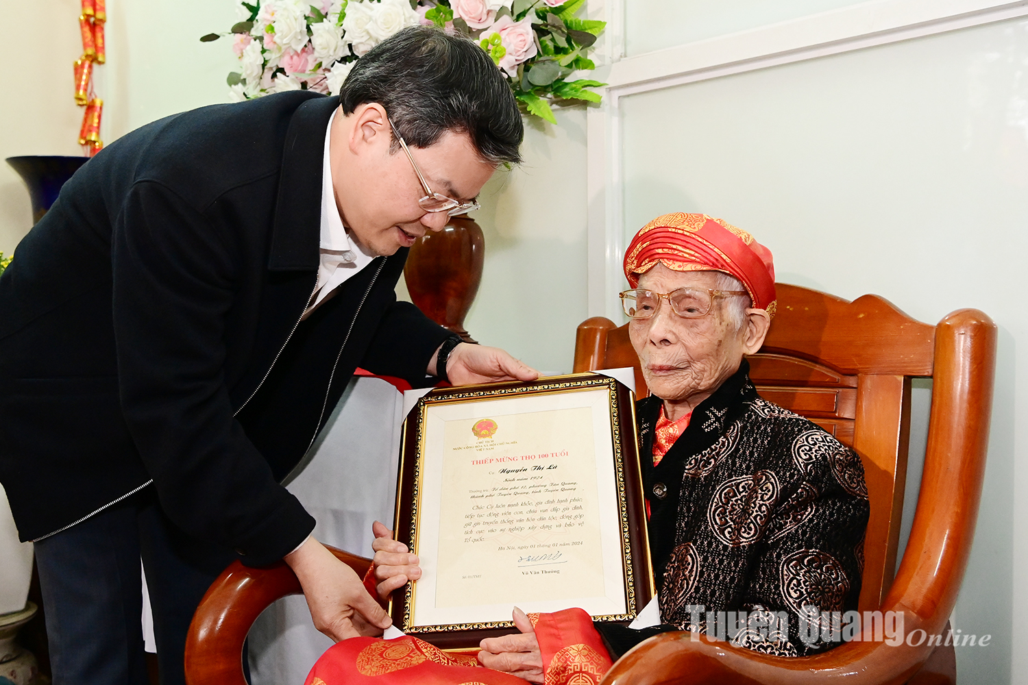 Đồng chí Chủ tịch UBND tỉnh Nguyễn Văn Sơn trao Thiếp mừng thọ 100 của Chủ tịch nước cho cụ Nguyễn Thị Lá tại tổ 12 phường Tân Quang.