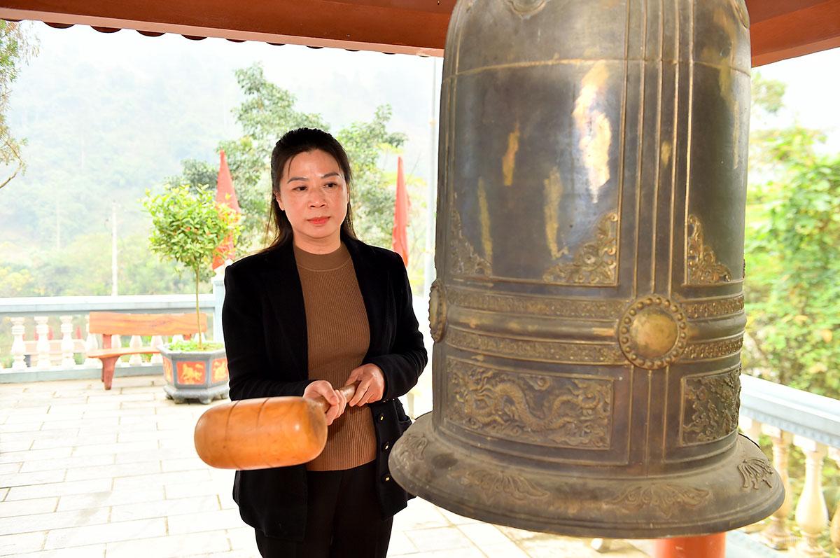 Đồng chí Phó Bí thư Thường trực Tỉnh ủy Lê Thị Kim Dung thỉnh chuông dâng lễ tại Đền thờ các Anh hùng liệt sỹ xã Minh Tân. |
