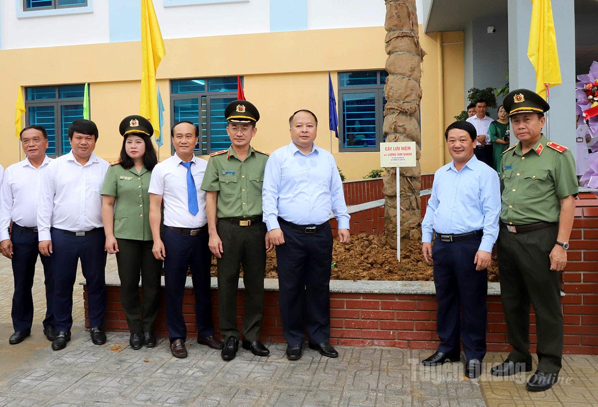 Các đồng chí lãnh đạo tỉnh; lãnh đạo Cục Xây dựng phong trào bảo vệ an ninh Tổ quốc; lãnh đạo Tập đoàn Đèo Cả trồng cây lưu niệm và chụp ảnh lưu niệm tại Khoa khám bệnh và điều trị, Bệnh viện Đa khoa khu vực Quản Bạ do Bộ trưởng Bộ Công an Lương Tam Quan trao tặng.