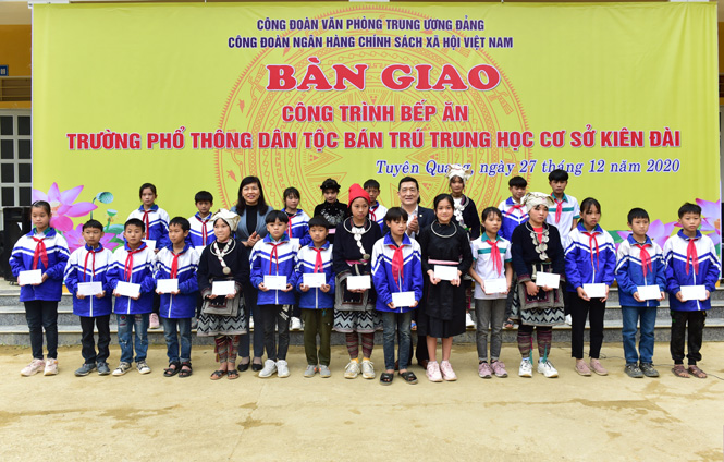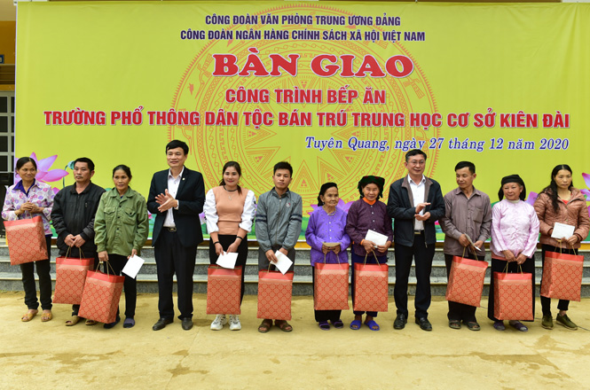 Nhân dịp này, Công đoàn Văn phòng Trung ương Đảng, Ngân hàng Chính sách xã hội Việt Nam bàn giao nhà bếp ăn và tặng 50 suất quà cho học sinh Trường Phổ thông dân tộc bán trú THCS Kiên Đài; tặng quà cho 10 gia đình chính sách, hộ nghèo xã Kiên Đài.