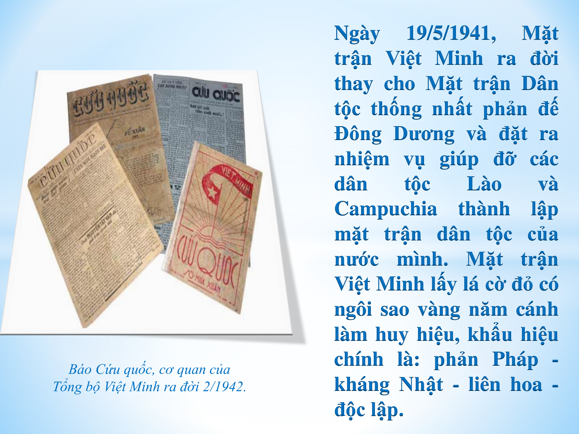 Ngày 19/5/1941, Mặt trận Việt Nam độc lập đồng minh (gọi tắt là Mặt trận Việt Minh) ra đời, thay cho Mặt trận Dân tộc thống nhất phản đế Đông Dương. Việc quyết định thành lập Mặt trận Việt Minh là một chủ trương hết sức sáng suốt của Trung ương Đảng và Lãnh tụ Nguyễn Ái Quốc, có ý nghĩa quan trọng vào sự phát triển phong trào cách mạng giải phóng dân tộc mà đỉnh cao là thắng lợi của Cách mạng tháng Tám năm 1945.