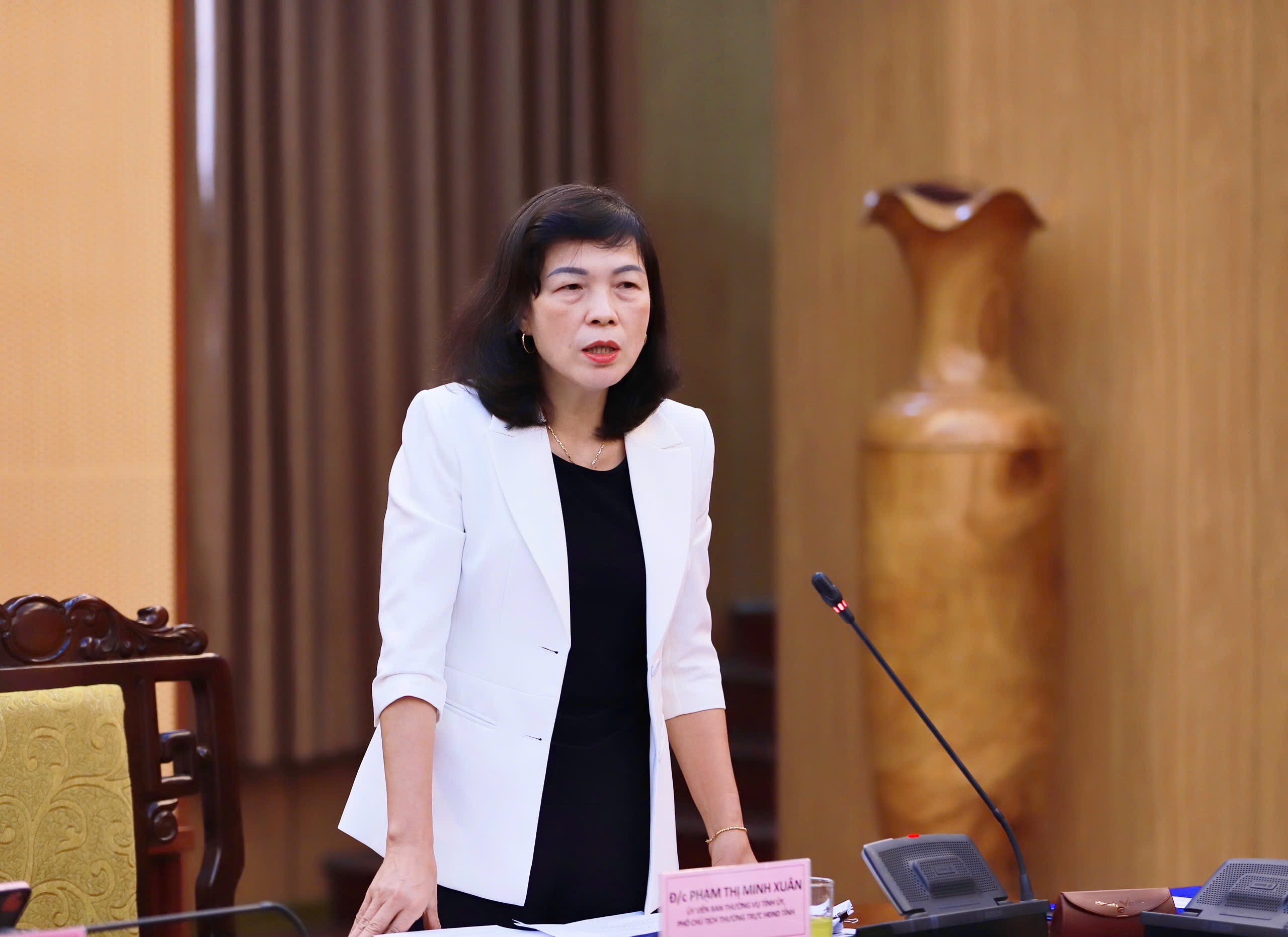 Phó Chủ tịch HĐND tỉnh Phạm Thị Minh Xuân phát biểu tại phiên họp.