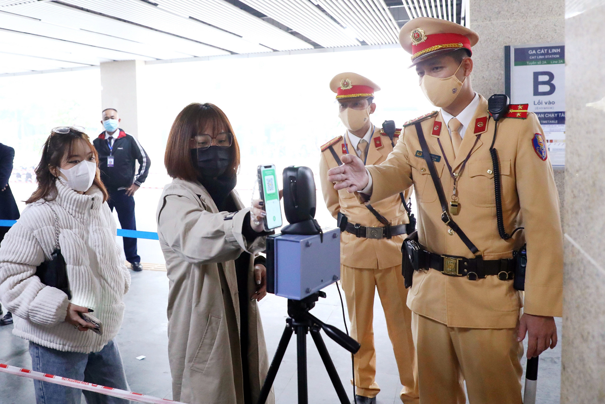 Cán bộ, chiến sĩ cảnh sát giao thông hướng dẫn người dân quét mã QR tại các ga tàu điện trên cao. Ảnh: TTXVN