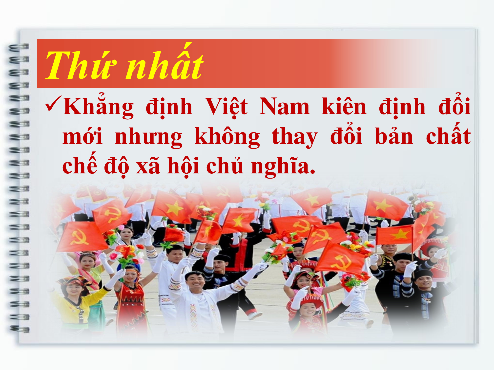 Thứ nhất, cần khẳng định Việt Nam kiên định đổi mới nhưng không thay đổi bản chất chế độ xã hội chủ nghĩa. Bởi lẽ, đổi mới vừa là sự thay thế cái cũ, vừa là sự chọn lựa cái cũ, cái hiện đang còn tác dụng để cải biến cho nó trở nên phù hợp hơn. Việt Nam lựa chọn đổi mới đồng bộ, hài hòa giữa kinh tế và chính trị với mục tiêu giữ vững định hướng xã hội chủ nghĩa, xây dựng thành công chủ nghĩa xã hội ở nước ta. Chúng ta thực hiện bước chuyển sang cơ chế thị trường, nhưng Nhà nước quản lý và điều hành theo định hướng xã hội chủ nghĩa, khắc phục tình trạng thả nổi thị trường; đổi mới để phát triển, để nâng tầm đất nước lên trình độ mới song phải đi đôi với thực hiện công bằng xã hội, khắc phục tình trạng phân hóa giàu - nghèo…vậy nên đổi mới chính là để hướng tới chủ nghĩa xã hội, để hiện thực quá độ lên chủ nghĩa xã hội ngày càng được xác lập rõ ràng hơn.