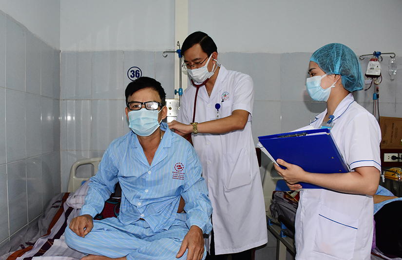 Bác sỹ chuyên khoa II Ngô Quang Chiến, Trưởng khoa Nội Tiêu hóa, Bệnh viện Đa khoa tỉnh thăm khám bệnh nhân đang điều trị tại khoa. Ảnh: Minh Hoa