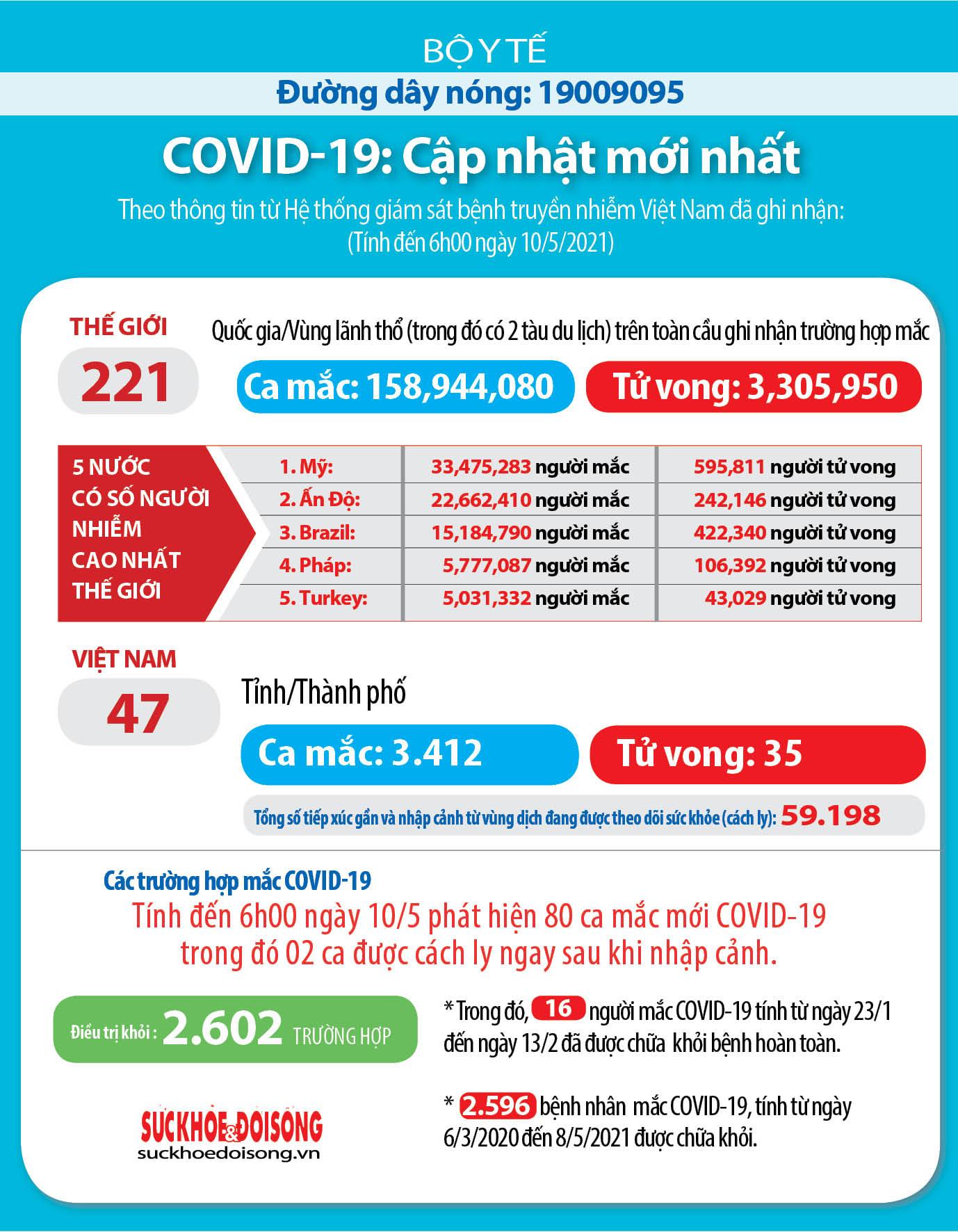 Bản tin sáng 10/5 của Bộ Y tế cho biết 12h trôi qua có thêm 80 ca mắc COVID-19, trong đó 2 ca nhập cảnh đã cách ly ngay; 78 ca ghi nhận tại cộng đồng. Việt Nam hiện có 3.412 bệnh nhân, thế giới đã ghi nhận trên 158,9 triệu ca.