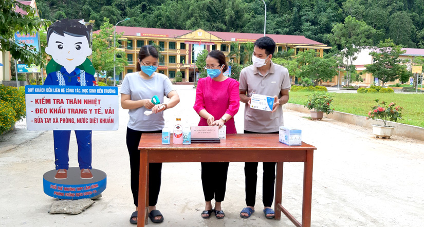 Cán bộ giáo viên trường THPT Lâm Bình chuẩn bị vật tư y tế để phục vụ cho kỳ thi tốt nghiệp THPT.