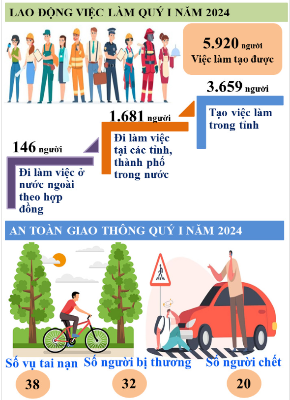 Lao động việc làm và an sinh xã hội: Tiếp tục thực hiện các giải pháp hỗ trợ, tạo việc làm cho người lao động; ước Quý I/2024, toàn tỉnh tạo việc làm cho 5.920 lao động, đạt 26,3% kế hoạch, bằng cùng kỳ năm 2023. Hướng dẫn, hỗ trợ các doanh nghiệp, người sử dụng lao động trên địa bàn thực hiện đúng các chế độ chính sách đối với người lao động theo quy định của pháp luật lao động, nhất là trong dịp Tết Nguyên đán Giáp Thìn 2024. Tiếp tục đôn đốc thực hiện các giải pháp phát triển đối tượng tham gia bảo hiểm xã hội, kết quả đến tháng 03/2024 tỷ lệ lao động tham gia bảo hiểm xã hội đạt 30,9% (kế hoạch năm đạt 31%); tỷ lệ lao động tham gia bảo hiểm thất nghiệp đạt 25,53% (kế hoạch năm đạt 24,7%). Tổ chức tặng quà đối với người có công với cách mạng nhân dịp Tết Nguyên đán Giáp Thìn với tổng số 16.479 suất quà với tổng kinh phí 6.915,4 triệu đồng; chăm lo, giúp đỡ các đối tượng chính sách xã hội nhân dịp Tết, có 5.014 hộ với 14.645 nhân khẩu được hỗ trợ lượng thực với tổng số 219.675 kg gạo (15kg/khẩu); trên 26.000 hộ gia đình, cá nhân được thăm hỏi và nhận quà tặng, hỗ trợ của các tổ chức, cá nhân, với tổng giá trị 12 tỷ đồng; thăm chúc thọ, tặng Thiếp mừng thọ và quà của Chủ tịch nước cho 74 người cao tuổi tròn 100 tuổi; chuyển Thiếp mừng thọ và quà của Chủ tịch Ủy ban nhân dân tỉnh chúc thọ 708 người cao tuổi đủ 90 tuổi. Duy trì chi trả trợ cấp thường xuyên cho trên 37.000 đối tượng bảo trợ xã hội tại cộng đồng. Thực hiện các chính sách, chương trình thúc đẩy bình đẳng giới và vì sự tiến bộ của phụ nữ; công tác tiếp nhận, quản lý, điều trị, cai nghiện cho người nghiện ma túy tại cơ sở cai nghiện ma túy tỉnh. Tiếp tục thực hiện Đề án giảm nghèo bền vững gắn với thực hiện Chương trình mục tiêu quốc gia giảm nghèo bền vững (năm 2023 tỷ lệ hộ nghèo đa chiều chung toàn tỉnh giảm 4,87% (từ 18,9% xuống còn 14,03%).