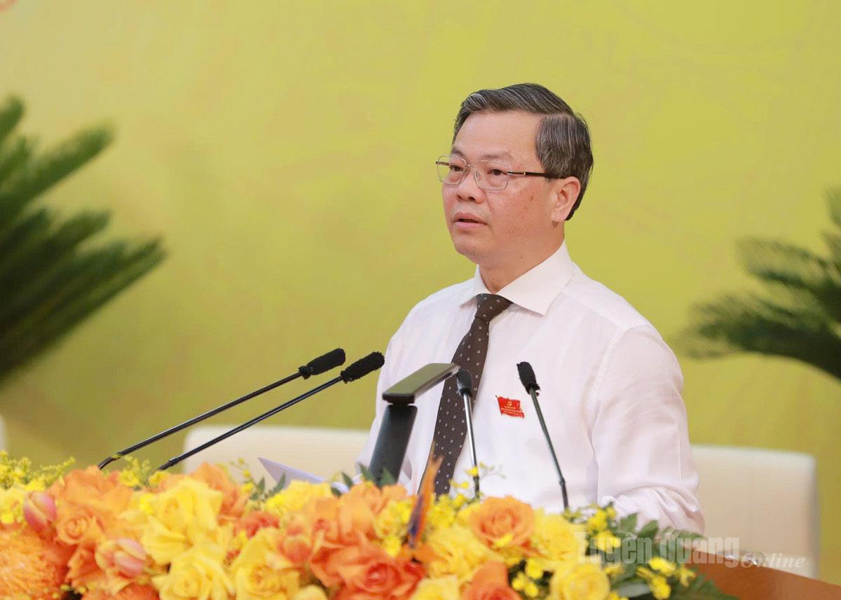 Đồng chí Nguyễn Văn Sơn, Phó Bí thư Tỉnh ủy, Chủ tịch HĐND tỉnh trình bày Báo cáo tổng hợp ý kiến tham gia vào dự thảo văn kiện Đại hội đại biểu toàn quốc lần thứ XIV của Đảng - Ảnh Duy Tuấn